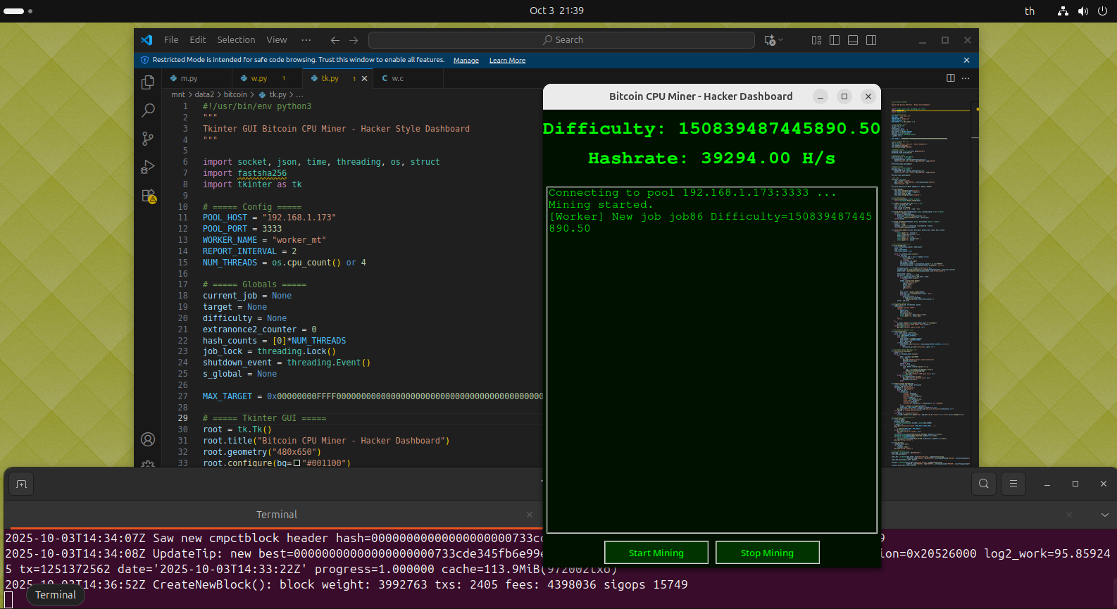 02 Oct 2025 15:04roadmap ของเวอร์ชันใหม่ก่อน จากนั้นจัดโค้ดให้ครบถ้วนสำหรับ SegWit, correct target, optimized hashing, submitblock บน mainnet/testnet/regtest 🚀 Roadmap เวอร์ชันใหม่ Coinbase + Witness Commitment คำนวณ witness merkle root ของ txs เพิ่ม output 0-value + scriptPubKey = OP_RETURN 0x24 <witness_merkle_root> ตาม BIP141 ทำให้ block ถูกต้องสำหรับ SegWit Target bits → Integer แปลง bits (compact) → target (256-bit int) ใช้เปรียบเทียบกับ header hash แบบ integer Optimized Hashing ใช้ hashlib.sha256 (C implementation) หรือ subprocess openssl dgst -sha256 -binary (optional) แทน double-python hashing → เร็วขึ้นหลายเท่า submitblock ใช้งานจริง ส่ง block hex แบบถูกต้อง → RPC submitblock ตรวจสอบ response → success/failure ทดสอบ เริ่มจาก regtest → สร้าง block ทดสอบได้ทันที แล้วขยายไป testnet/mainnet
