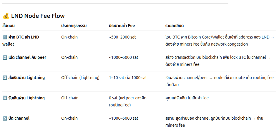 04 Oct 2025 03:41สรุปให้ชัด ๆ กันเลยว่า ถ้าคุณ เปิดโหนด LND (self-hosted) จะมีค่าใช้จ่ายแบบไหนบ้าง 🎯 1️⃣ ค่าธรรมเนียม On-chain (บันทึกลง Bitcoin blockchain) ทุกครั้งที่ทำ ธุรกรรมบน chain ต้องเสีย fee ให้ miners: กิจกรรม Fee ที่เกิดขึ้น อธิบาย เปิด channel กับ peer ใช้ BTC เป็น fee ให้ miners ต้องสร้าง transaction บน Bitcoin blockchain เพื่อ lock BTC ใน channel ปิด channel ใช้ BTC เป็น fee ให้ miners สถานะสุดท้ายของ channel ถูกบันทึกลง blockchain ฝาก/ถอน BTC จาก wallet ของคุณ ใช้ BTC เป็น fee ให้ miners เช่น โอน BTC เข้า LND หรือถอนออกไปที่ wallet อื่น 💡 สรุป: ทุกครั้งที่เกี่ยวข้องกับ on-chain transaction → ต้องเสีย fee 2️⃣ ค่าธรรมเนียม Off-chain (Lightning Network) เมื่อ BTC อยู่ใน channel แล้ว การจ่ายเงินผ่าน Lightning Network: กิจกรรม Fee ที่เกิดขึ้น อธิบาย จ่ายเงินให้ peer อื่น Routing fee (satoshis) Node ที่ช่วย route จะเก็บ fee เล็กน้อย รับเงินจาก peer อื่น ไม่มีค่าธรรมเนียม แต่ peer อาจตั้ง fee สำหรับ routing ต่อ 💡 สรุป: การจ่ายเงินผ่าน Lightning Network เร็วและถูกกว่า on-chain เพราะไม่บันทึกลง blockchain ทุกครั้ง 3️⃣ ค่าธรรมเนียมอื่น ๆ ค่าดูแล/เช่า server (ถ้าใช้ VPS) ค่าไฟ ถ้าใช้โหนดบ้านตัวเอง ค่าซิงก์ blockchain (พื้นที่ storage, bandwidth) 4️⃣ ภาพรวม [Bitcoin Wallet] --(on-chain fee)--> [LND wallet] --(off-chain fee)--> [Lightning payments] เปิด/ปิด channel = on-chain fee ส่ง Lightning payments = routing fee ฝาก/ถอน BTC = on-chain fee ถ้าคุณต้องการ ผมสามารถทำ ตารางตัวอย่างค่าใช้จ่ายจริง + workflow ตั้งแต่ฝาก BTC → เปิด channel → ส่ง Lightning → ปิด channel ให้เห็นตัวเลขชัด ๆ ⚡