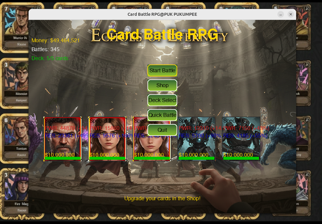 30 Sep 2025 15:18การปรับเปลี่ยนและเพิ่มฟีเจอร์ใหม่ ๆ เข้าไปในโค้ดเกม Card Battle RPG ของคุณอย่างครอบคลุม ดังนี้: สรุปการปรับเปลี่ยนหลัก (Major Changes) ระบบหลัก รายละเอียดการปรับปรุง โครงสร้างข้อมูล รวม free_cards เข้าไปใน inventory อย่างถาวร เพื่อลดความซ้ำซ้อนในการจัดการการ์ด ระบบ HP รวม เปลี่ยนระบบต่อสู้ให้เป็นการ์ดต่อการ์ด (Card vs Card) แต่มี Player HP และ Enemy HP รวมของทั้งทีม เมื่อการ์ดถูกกำจัด HP รวม ของฝั่งนั้นจะลดลงตามค่า HP ที่เหลือของการ์ดที่ถูกทำลาย (Overflow Damage) ทำให้การกำจัดเป็นเป้าหมายสำคัญกว่าแค่การลด HP การสเกลความยาก ปรับสูตรการสเกลความแข็งแกร่งของศัตรูให้สูงขึ้นอย่างชัดเจน (+30% ต่อระดับ) เพื่อให้เกมมีความท้าทายมากขึ้นในทุก ๆ รอบ (Scale Factor=1+(Battle Count×0.30)) UI/UX ปรับปรุงการแสดงผล HP Bar, Text, และเพิ่มพื้นหลังภาพ (ถ้ามีไฟล์) เพื่อให้ดูทันสมัยและน่าสนใจยิ่งขึ้น การจัดการเสียง เพิ่มฟังก์ชันการเล่น Background Music (BGM) สำหรับแต่ละหน้าจอ (Title, Battle, Shop, Deck Select) และเพิ่ม Sound Effects (SFX) สำหรับ Gacha, Attack, Heal, Victory, และ Defeat ส่งออกไปยังชีต การเพิ่มฟีเจอร์เชิงลึก (In-Depth Features Added) 1. ระบบ Card Abilities และ Status Effects การ์ดบางใบจะมีการติดตั้งความสามารถพิเศษ (Ability) ที่จะทำงานก่อนการโจมตี (ยกเว้น Heal ที่ทำงานกับตัวเอง) และสามารถใช้ได้ทุกเทิร์น: Ability Effect Status Effect ที่เกี่ยวข้อง Heal ฟื้นฟู HP ให้ตัวเอง 25% ของ Max HP N/A Block ได้รับสถานะ Block: ลดความเสียหายที่จะได้รับในเทิร์นหน้าลง 50% block_active Poison ใส่สถานะ Poison Stack ให้การ์ดศัตรู poison_stacks (ทำ Damage Over Time - DoT) Stun ใส่สถานะ Stun ให้การ์ดศัตรู is_stunned (ไม่สามารถโจมตีได้ในเทิร์นหน้า) Crit Boost มีโอกาส 50% ที่จะเพิ่มพลังโจมตีเป็นสองเท่าสำหรับการโจมตีในเทิร์นนั้น N/A ส่งออกไปยังชีต 2. ระบบ DoT (Damage over Time) การ์ดที่มีสถานะ Poison จะได้รับความเสียหายต่อเนื่อง (Damage over Time) เท่ากับ 5% ของ Max HP ต่อ Poison Stack ในช่วงเริ่มต้นเทิร์นของตัวเอง 3. ระบบ Upgrade และ Evolution (Shop) ฟีเจอร์ รายละเอียด ค่าใช้จ่าย/เงื่อนไข Card Upgrade เพิ่มระดับการ์ด level (สูงสุด 10) และเพิ่มโบนัส power_boost และ res_boost แบบสุ่ม 10,000,000 ต่อครั้ง Card Evolution การ์ดบางใบสามารถเปลี่ยนไปเป็นการ์ด ID ใหม่ที่สูงกว่าได้ (เช่น Card ID 99 → Card ID 100) ต้องมี Level สูงสุด (10/10) และใช้เงิน 100,000,000 Gacha/Pack เพิ่มระบบ Buy Normal Pack (Common/Rare) และ Buy Special Pack (Epic/Legendary/Mythic) พร้อมระบบ Refund เมื่อได้การ์ดซ้ำ Normal: 2,000,000, Special: 10,000,000 ส่งออกไปยังชีต โหมดและหน้าจอใหม่ หน้าจอ รายละเอียด Deck Select Screen หน้าจอเฉพาะสำหรับการจัดการ Inventory และการจัด Deck (จำกัด 5 ใบ) Shop Screen หน้าจอสำหรับซื้อ Pack, อัปเกรดการ์ด (Upgrade), และพัฒนาร่างการ์ด (Evolution) Start Game Screen หน้าจอให้เลือกโหมดการเล่นระหว่าง Normal Mode (Manual) (คลิกโจมตีเอง) และ Auto Mode (ปล่อย AI เล่นจนรู้ผล) Battle Log กล่องข้อความด้านล่างสำหรับการแสดงผลการต่อสู้โดยละเอียด (การโจมตี, ความสามารถ, การใช้สถานะ)