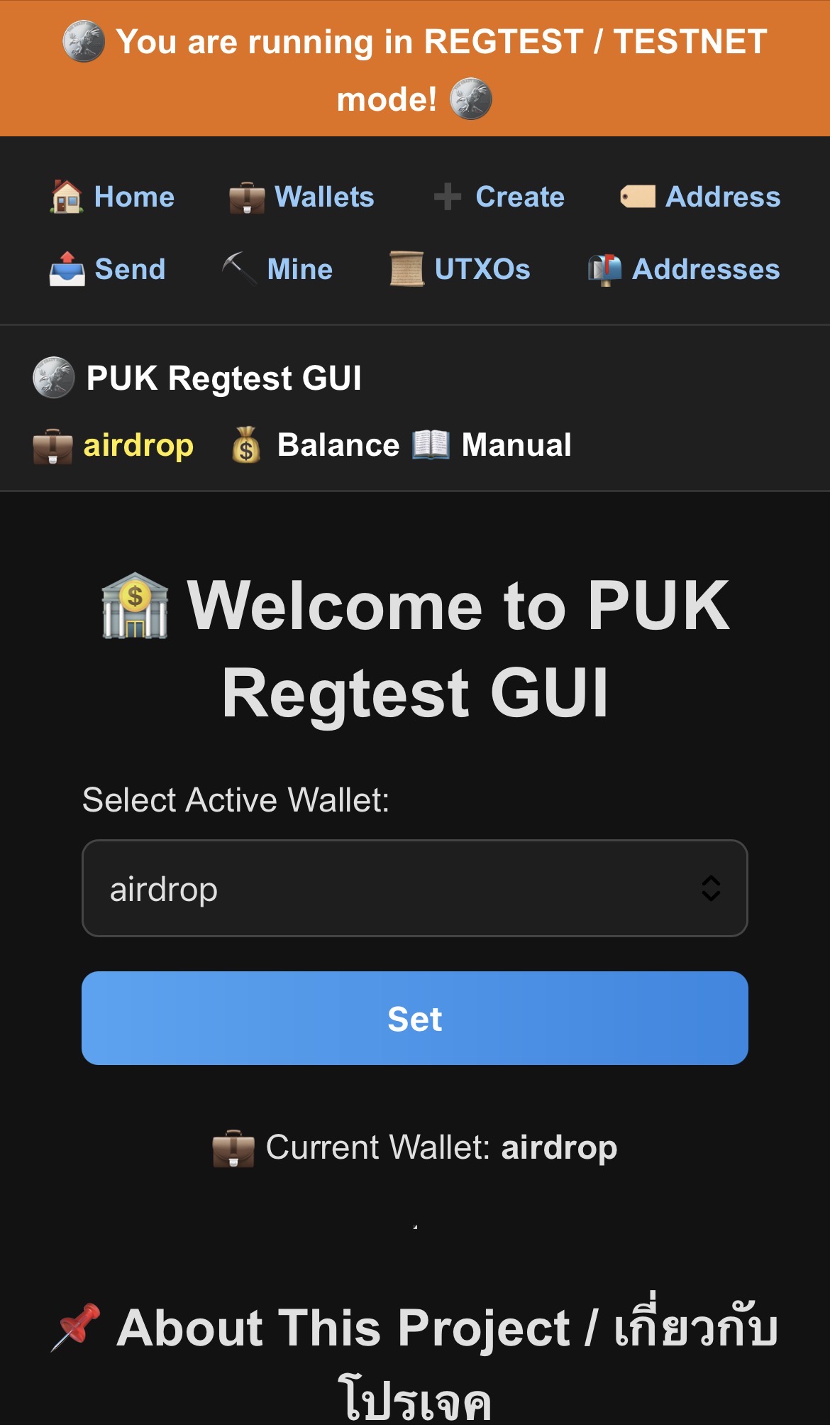 09 Nov 2025 07:31📌 About This Project / เกี่ยวกับโปรเจค PUK Regtest GUI เป็นเว็บแอปสำหรับจัดการเหรียญ PUK บน Bitcoin Regtest network โดยใช้ Flask + bitcoin-cli เหมาะสำหรับนักพัฒนาและผู้เรียนที่ต้องการทดลองสร้าง, ขุด, ส่งเหรียญ และจัดการ wallet แบบปลอดภัยโดยไม่กระทบ mainnet. PUK Regtest GUI is a web application for managing PUK coins on a Bitcoin Regtest network. It is designed for developers and learners to safely create, mine, send coins, and manage wallets without affecting mainnet. 🔹 Features / ฟีเจอร์หลัก Wallet Management: Create, load, and select active wallet / สร้าง, โหลด, และเลือก wallet ปัจจุบัน Address & Balance: Generate addresses and check balances / สร้าง address และตรวจสอบยอดเงิน Transactions: Send coins to other addresses / ส่งเหรียญไปยัง address อื่น Mining: Mine blocks to specific addresses / ขุดบล็อกไปยัง address ที่ต้องการ UTXO Management: List and paginate UTXOs, show total balances / แสดงรายการ UTXO พร้อม pagination และยอดรวม 🎯 Goals / เป้าหมาย Learn and experiment with Bitcoin/UTXO concepts / เรียนรู้และทดลองระบบ Bitcoin/UTXO Develop blockchain for PUKCoin TimeCapsule / พัฒนาบล็อกเชนในโปรเจค PUKCoin TimeCapsule Use PUK coins to "unlock" source code for programs / ใช้เหรียญ PUK เปิดซอสโค้ดโปรแกรมต่าง ๆ Enable future development by extending programs easily / สนับสนุนการพัฒนาโปรแกรมต่อยอดในอนาคต Provide an easy-to-use web interface for learning and development / มีเว็บอินเตอร์เฟซใช้งานง่ายสำหรับผู้เรียนและนักพัฒนา