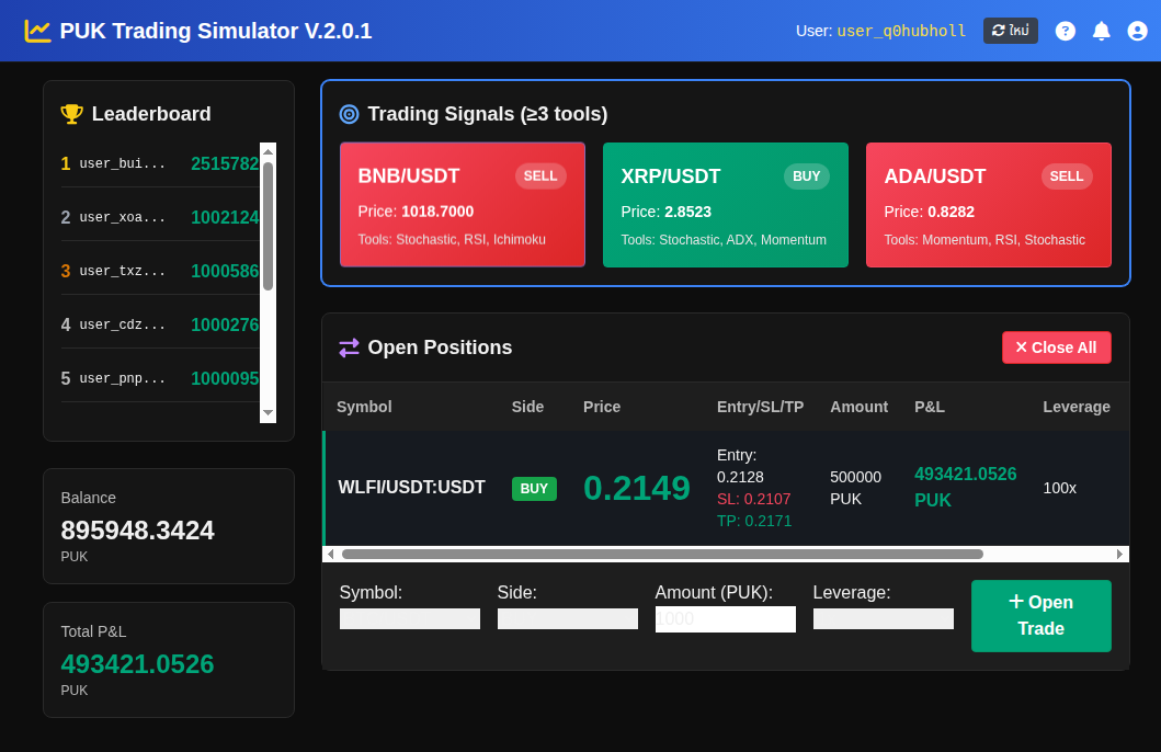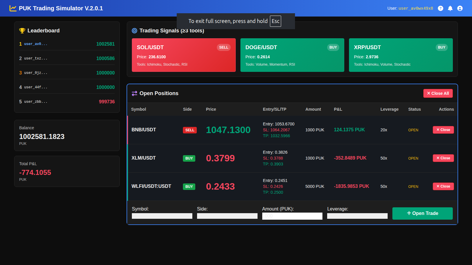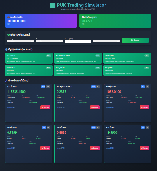 21 Sep 2025 23:30ยินดีต้อนรับสู่ PUK Trading Simulator! นี่คือระบบจำลองการเทรดคริปโตด้วยเงินเสมือน (PUK) เพื่อฝึกฝนทักษะการเทรดโดยไม่มีความเสี่ยงจริง ขั้นตอนการเทรด: เลือกคู่เหรียญ: เลือกสัญลักษณ์คริปโตจาก dropdown (เช่น BTC/USDT) ที่ต้องการเทรด เลือกทิศทาง: BUY: คาดว่าราคาจะขึ้น (ซื้อ) SELL: คาดว่าราคาจะลง (ขาย) จำนวนเงิน: ใส่จำนวน PUK ที่ต้องการใช้ (เริ่มต้น 1000 PUK) เลเวอเรจ: เลือกระดับ (1x-100x) เพื่อขยายกำไร/ขาดทุน (ระวังความเสี่ยง!) เปิดเทรด: กดปุ่ม "Open Trade" เพื่อเปิดตำแหน่งใหม่ (Entry, SL, TP จะคำนวณอัตโนมัติ) การติดตามและจัดการ: ตาราง Open Positions: ดูราคาปัจจุบัน, PNL (กำไร/ขาดทุน), SL (Stop Loss), TP (Take Profit), Leverage และสถานะ ปิดเทรด: กด "Close" เพื่อปิดตำแหน่งก่อนถึง SL/TP (PNL จะคำนวณตามราคาปัจจุบัน) ปิดทุกตำแหน่ง: กด "Close All" เพื่อปิดทุก OPEN positions ในครั้งเดียว สัญญาณเทรด: ดูสัญญาณจากเครื่องมือวิเคราะห์ (≥3 tools) เพื่อช่วยตัดสินใจ Balance & Total P&L: ดูยอดเงินคงเหลือและกำไรรวม (อัปเดตเรียลไทม์) Leaderboard: เปรียบเทียบอันดับกับผู้เล่นอื่น เคล็ดลับ: ใช้ SL/TP เพื่อจำกัดความเสี่ยง เริ่มด้วย Leverage ต่ำเพื่อฝึกฝน ราคาอัปเดตจาก Binance จริง (แต่เป็น simulation) หากถึง SL/TP ตำแหน่งจะปิดอัตโนมัติ หากมีปัญหา ลองรีเฟรชหน้าเว็บ หรือติดต่อ support