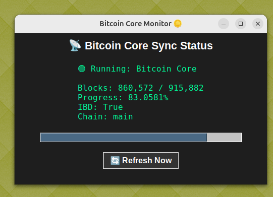 22 Sep 2025 13:11import tkinter as tk from tkinter import ttk import subprocess import json import threading import time # --- Config --- CLI = "/usr/local/bin/bitcoin-cli" DATADIR = "/mnt/data2/bitcoin" RPCUSER = "xxxx" RPCPASS = "xxxx" class BitcoinMonitor(tk.Tk): def __init__(self): super().__init__() self.title("Bitcoin Core Monitor 🪙") self.geometry("500x300") self.configure(bg="#1e1e1e") # Title self.label_title = tk.Label( self, text="📡 Bitcoin Core Sync Status", font=("Arial", 16, "bold"), fg="white", bg="#1e1e1e" ) self.label_title.pack(pady=10) # Info area self.info_text = tk.StringVar() self.label_info = tk.Label( self, textvariable=self.info_text, font=("Consolas", 12), fg="#00ff99", bg="#1e1e1e", justify="left" ) self.label_info.pack(pady=10) # Progress bar self.progress = ttk.Progressbar(self, length=400, mode="determinate", maximum=100) self.progress.pack(pady=10) # Refresh button self.refresh_btn = tk.Button( self, text="🔄 Refresh Now", command=self.update_status, bg="#333", fg="white", font=("Arial", 12, "bold") ) self.refresh_btn.pack(pady=10) # Auto update thread self.running = True threading.Thread(target=self.auto_update, daemon=True).start() # Handle closing window self.protocol("WM_DELETE_WINDOW", self.on_close) def on_close(self): self.running = False self.destroy() # ฟังก์ชันเรียก bitcoin-cli พร้อม datadir และ RPC def get_status(self): try: output = subprocess.check_output( [CLI, f"-datadir={DATADIR}", f"-rpcuser={RPCUSER}", f"-rpcpassword={RPCPASS}", "getblockchaininfo"], stderr=subprocess.STDOUT ) return json.loads(output) except subprocess.CalledProcessError as e: msg = e.output.decode() if "error code: -28" in msg: # Node ยัง sync อยู่ return {"blocks": 0, "headers": 0, "verificationprogress": 0, "initialblockdownload": True, "chain": "unknown"} print("Error calling bitcoin-cli:", msg) return None except Exception as e: print("Other error:", e) return None # อัปเดต GUI def update_status(self): info = self.get_status() if not info: self.info_text.set("❌ Bitcoin Core is not running or RPC failed.") self.progress["value"] = 0 return blocks = info.get("blocks", 0) headers = info.get("headers", 0) progress = info.get("verificationprogress", 0) * 100 text = ( f"🟢 Running: Bitcoin Core\n\n" f"Blocks: {blocks:,} / {headers:,}\n" f"Progress: {progress:.4f}%\n" f"IBD: {info.get('initialblockdownload', True)}\n" f"Chain: {info.get('chain', 'unknown')}" ) self.info_text.set(text) self.progress["value"] = progress # อัปเดตอัตโนมัติทุก 5 วินาที def auto_update(self): while self.running: self.update_status() time.sleep(5) if __name__ == "__main__": app = BitcoinMonitor() app.mainloop()