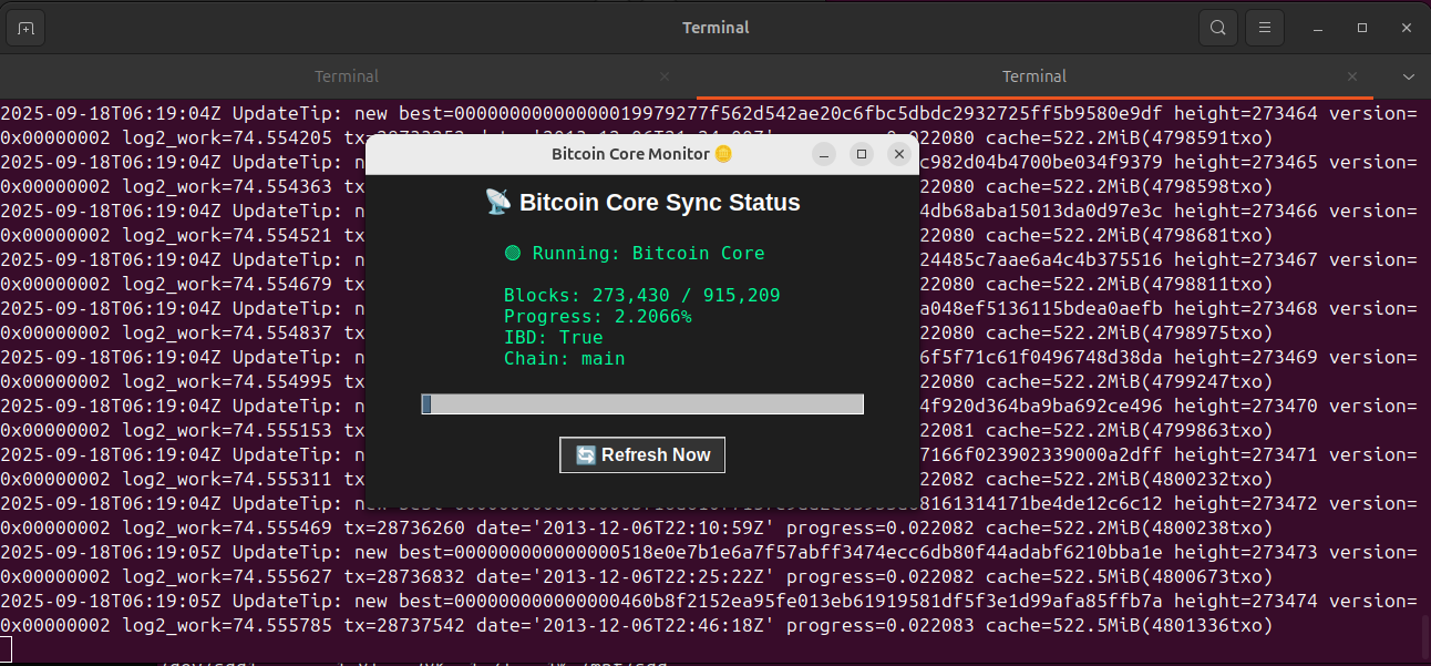 18 Sep 2025 06:19import tkinter as tk from tkinter import ttk import subprocess, json import threading, time CLI = ["/mnt/sdd/bitcoin-27.2/bin/bitcoin-cli", "-datadir=/mnt/sdd/bitcoin-data"] class BitcoinMonitor(tk.Tk): def __init__(self): super().__init__() self.title("Bitcoin Core Monitor 🪙") self.geometry("500x300") self.configure(bg="#1e1e1e") # Title self.label_title = tk.Label(self, text="📡 Bitcoin Core Sync Status", font=("Arial", 16, "bold"), fg="white", bg="#1e1e1e") self.label_title.pack(pady=10) # Info area self.info_text = tk.StringVar() self.label_info = tk.Label(self, textvariable=self.info_text, font=("Consolas", 12), fg="#00ff99", bg="#1e1e1e", justify="left") self.label_info.pack(pady=10) # Progress bar self.progress = ttk.Progressbar(self, length=400, mode="determinate") self.progress.pack(pady=10) # Refresh button self.refresh_btn = tk.Button(self, text="🔄 Refresh Now", command=self.update_status, bg="#333", fg="white", font=("Arial", 12, "bold")) self.refresh_btn.pack(pady=10) # Auto update thread self.running = True threading.Thread(target=self.auto_update, daemon=True).start() def get_status(self): try: output = subprocess.check_output(CLI + ["getblockchaininfo"]) return json.loads(output) except Exception: return None def update_status(self): info = self.get_status() if not info: self.info_text.set("❌ Bitcoin Core is not running.") self.progress["value"] = 0 return blocks = info["blocks"] headers = info["headers"] progress = info["verificationprogress"] * 100 text = ( f"🟢 Running: Bitcoin Core\n\n" f"Blocks: {blocks:,} / {headers:,}\n" f"Progress: {progress:.4f}%\n" f"IBD: {info['initialblockdownload']}\n" f"Chain: {info['chain']}" ) self.info_text.set(text) self.progress["value"] = progress def auto_update(self): while self.running: self.update_status() time.sleep(5) # refresh ทุก 5 วินาที if __name__ == "__main__": app = BitcoinMonitor() app.mainloop()
