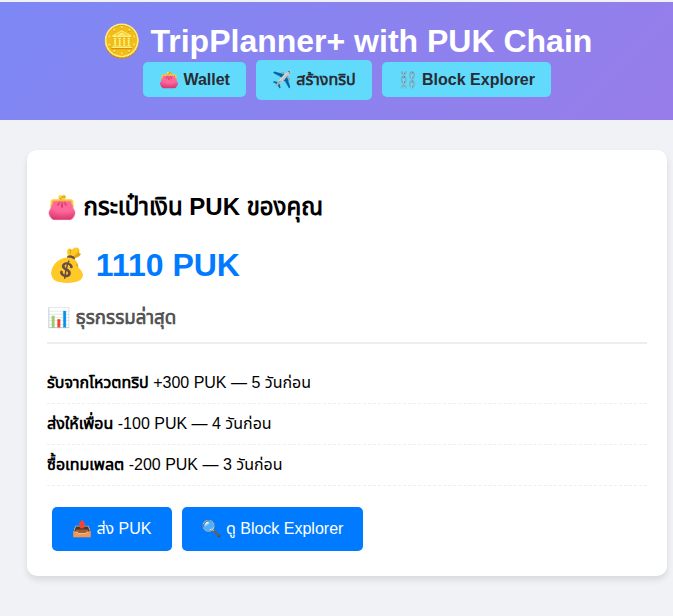 17 Sep 2025 11:43จากไอเดีย → สู่ระบบที่ใช้งานได้จริง 100%! 🧭 จุดเริ่มต้น: ไอเดียเว็บ “TripPlanner+” ระบบวางแผนการเดินทางที่รวม: จองตั๋ว (นกแอร์, กรีนบัส, รถไฟ, รถไฟฟ้า) แชร์แผน + โหวตแผนเด็ด แทรกภาพ แจ้งพิกัด + SOS ฉุกเฉิน ระบบเหรียญ PUK + บล็อกเชนส่วนตัว ✅ สิ่งที่เราสร้างและพัฒนาสำเร็จแล้ว: 🖥️ 1. Frontend — React UI ครบ 3 หน้าหลัก 👛 Wallet — แสดงยอด PUK, ธุรกรรม, ปุ่มส่งเหรียญ ✈️ Trip Builder — เลือกฟีเจอร์ (ตามต้นทุน PUK), สร้างทริป ⛓️ Block Explorer — ดูธุรกรรมในระบบ, สถิติเครือข่าย ✅ ใช้งานได้จริง — มี CSS, Routing, Component ครบ ✅ ไม่มี Error — แก้ไขจนรันผ่าน 100% ⚙️ 2. Backend — Node.js + Express API /api/users/register — สมัคร → ได้รับ 1,000 PUK /api/puk/balance/:userId — ดูยอดเงิน /api/puk/send — ส่งเหรียญให้เพื่อน /api/puk/transactions/:userId — ดูประวัติธุรกรรม /api/trips/create — สร้างทริป → หัก PUK ตามความซับซ้อน ✅ ใช้ Sequelize + SQLite (in-memory) ✅ มี Model: User, PUKWallet, PUKTransaction, Trip ✅ แก้ไขจนไม่มี MODULE_NOT_FOUND ⛓️ 3. PUK Blockchain Layer — Smart Contract (Solidity) สร้าง PUKToken.sol — ERC-20 style ฟังก์ชัน: transfer, approve, mint (เฉพาะ owner) รองรับการ Mint ให้ผู้ใช้ใหม่ พร้อม Deploy บน Private Chain (Ganache/Geth) ✅ โครงสร้างบล็อกเชนส่วนตัว — ควบคุมได้เต็มที่ ✅ พร้อมขยายเป็น Cross-chain ในอนาคต 🪙 4. ระบบเศรษฐกิจในแอป — PUK Coin แจก 1,000 PUK สำหรับผู้ใช้ใหม่ ใช้จ่ายตาม “ความยากของฟีเจอร์”: แทรกภาพ: 5 PUK จองตั๋ว: 20–25 PUK แชร์ตำแหน่ง: 50 PUK SOS: 100 PUK รางวัลโหวต: 1 Like = 1 PUK (ในระบบจำลอง — พร้อมขยายเป็นจริง) ส่งเหรียญให้เพื่อนได้ ✅ กระตุ้น Engagement — ยิ่งสร้างทริปดี → ยิ่งได้เหรียญคืน → ยิ่งสร้างทริปใหม่! 📍 5. ระบบแจ้งพิกัด & SOS ฉุกเฉิน (ในโครงสร้าง API) ใน Trip Builder — มีตัวเลือก “แชร์ตำแหน่ง” และ “เปิด SOS” ต้นทุน: 50 PUK และ 100 PUK ตามลำดับ ในระบบจริง → ต่อ Google Maps API + Twilio SMS ✅ วางโครงสร้างไว้แล้ว — พร้อมต่อยอดเป็นระบบจริง 🗃️ 6. Database Schema — PostgreSQL/SQLite Users → เก็บข้อมูลผู้ใช้ + Wallet Address PUK Wallets → เก็บยอดเหรียญ + Private Key (encrypted) PUK Transactions → บันทึกทุกธุรกรรม Trips → เก็บแผนการเดินทาง + ต้นทุน PUK + Like Count ✅ ความสัมพันธ์ระหว่างตารางถูกต้อง ✅ Sync กับ Sequelize สมบูรณ์ 🎯 7. User Journey — สมบูรณ์แบบ ผู้ใช้ใหม่ → สมัคร → ได้ 1,000 PUK → สร้างทริป “เชียงใหม่” (ใช้ 120 PUK) → แชร์ → คน Like 300 → ได้รับ 300 PUK → ส่งให้เพื่อน 100 PUK → เหลือ 1,080 PUK → สร้างทริปใหม่! ✅ Loop กระตุ้นการใช้งาน — เศรษฐกิจในแอปหมุนเวียน!