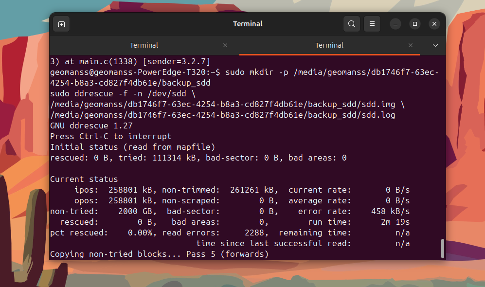 18 Sep 2025 03:20geomanss@geomanss-PowerEdge-T320:/mnt/newhdd$ sudo mkfs.ext4 /dev/sdd1 mke2fs 1.47.0 (5-Feb-2023) Warning: could not erase sector 2: Input/output error Creating filesystem with 488378368 4k blocks and 122101760 inodes Filesystem UUID: 7548a92b-9572-42c1-8d1e-4aed8630d436 Superblock backups stored on blocks: 32768, 98304, 163840, 229376, 294912, 819200, 884736, 1605632, 2654208, 4096000, 7962624, 11239424, 20480000, 23887872, 71663616, 78675968, 102400000, 214990848 Allocating group tables: done Warning: could not read block 0: Input/output error Warning: could not erase sector 0: Input/output error Writing inode tables: done Creating journal (262144 blocks):